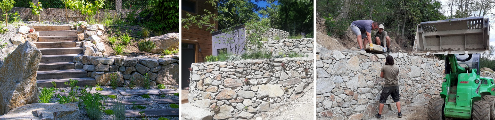 Toto riešenie je ideálne pre záhrady kde je potrebné prekonať väčšie výškové rozdiely. Stabilitu múru zabezpečujú objemné kamene s vysokou váhou, vďaka čomu nie je potrebné múr spevňovať betonážou a inými zásahmi. Dosiahneme tak prirodzené riešenie bez použitia umelých tvárnic a betónu. Múr zároveň dostatočne prepúšťa vodu a diery pomedzi kamene vysádzame vhodnými suchomilnými drevinami a trvalkami. Koreňový systém rastlín ešte viac spevní múr a rozrastené rastliny nám ponúknu krásny kontrast medzi jemnosťou zelene a tvrdosťou kameňa.