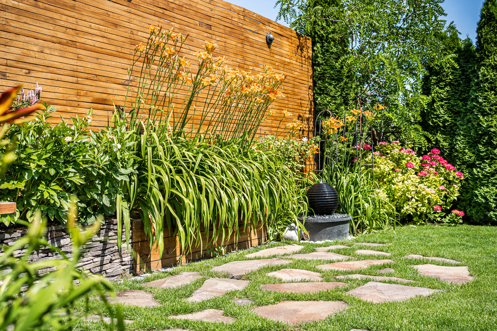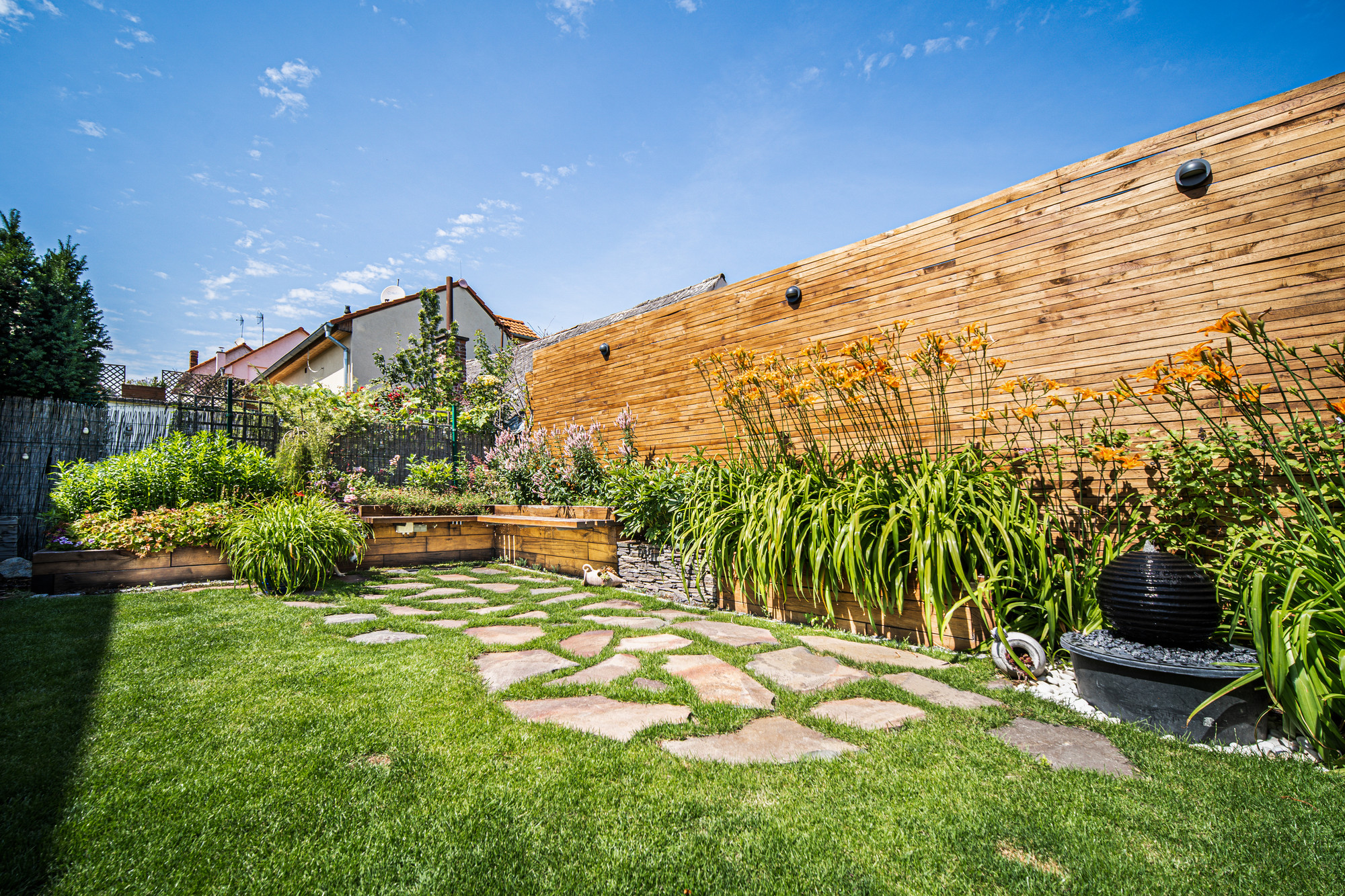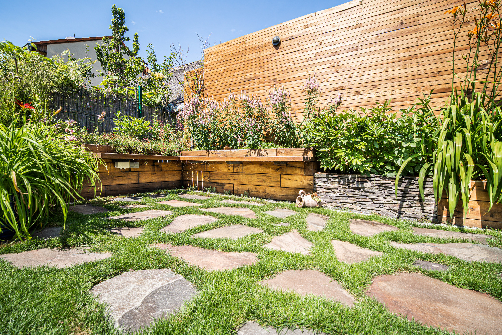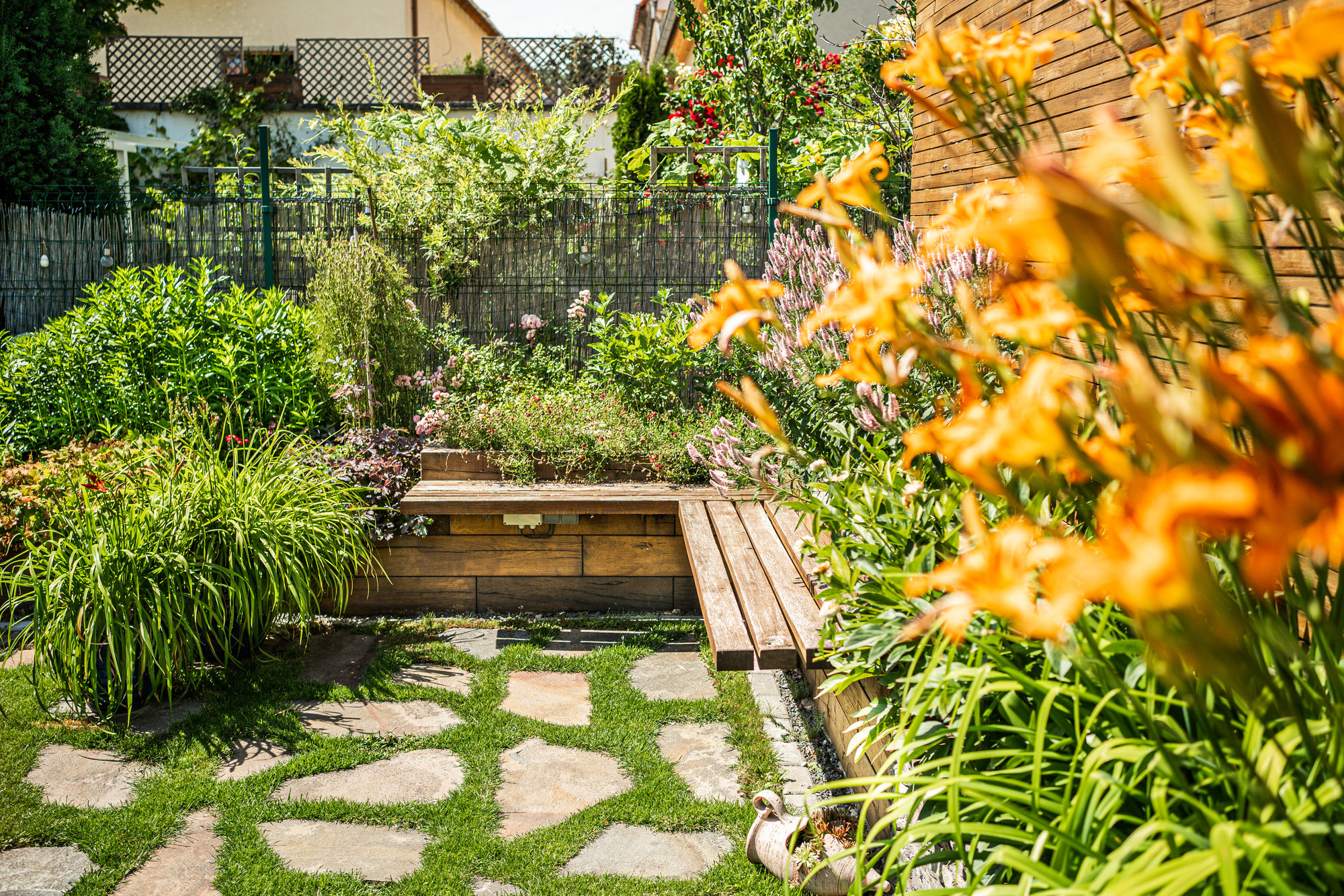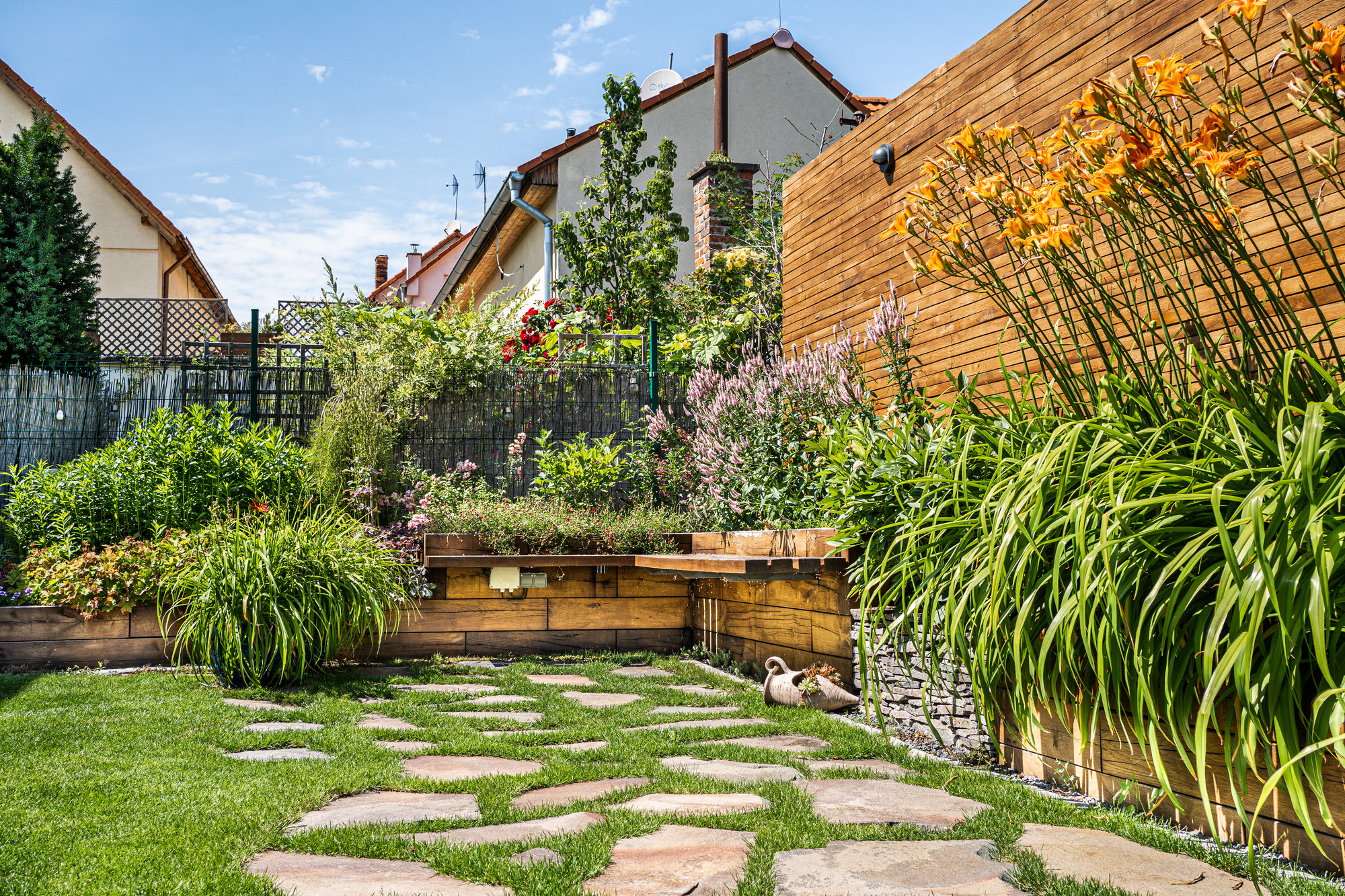 Aj malý priestor vie ponúknuť príjemnú atmosféru na oddych a rodinné stretnutia. Súkromie zabezpečuje dubová zástena a výsadby v dominantnom vyvýšenom záhone z masívnych hranolov.