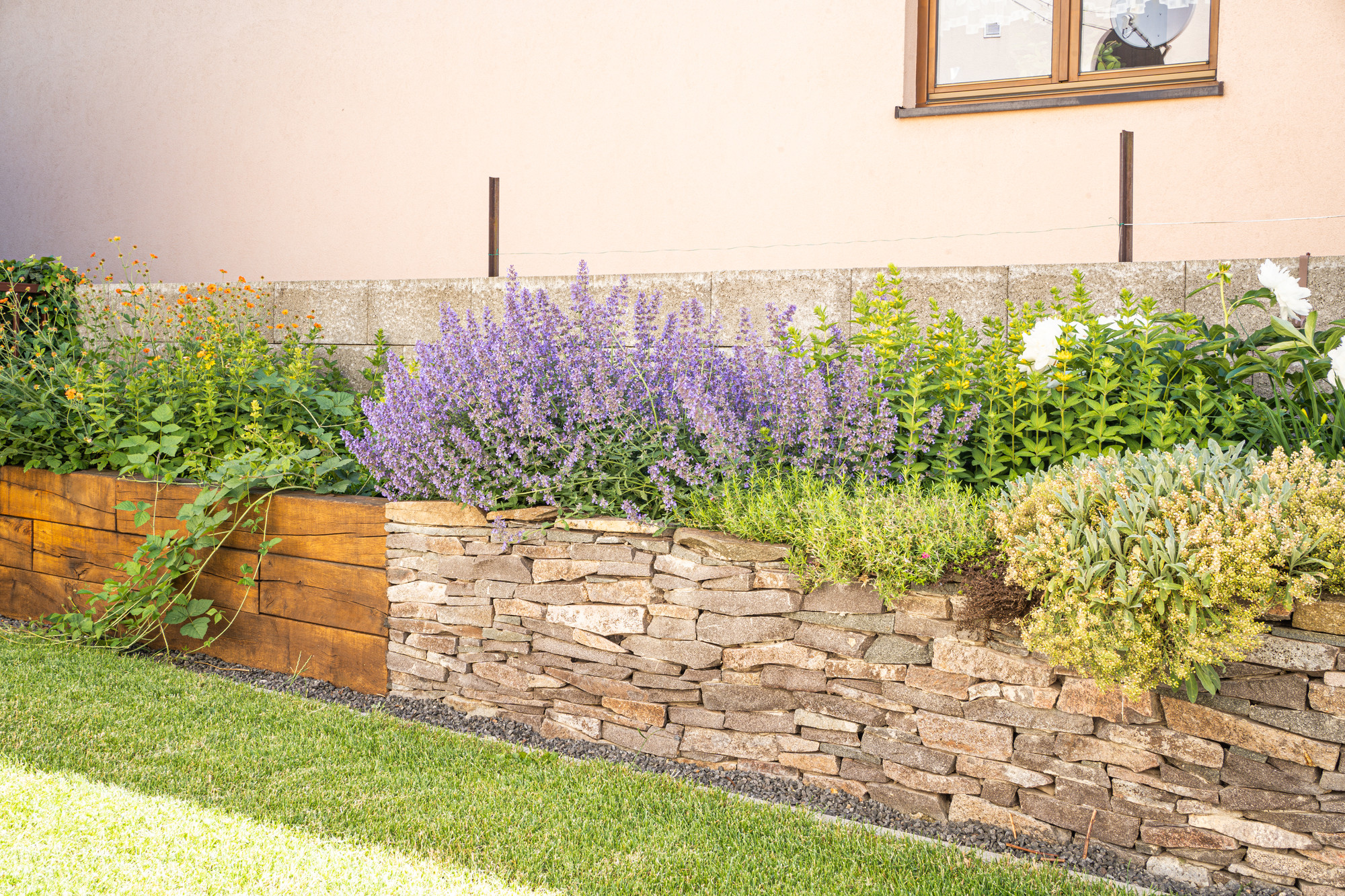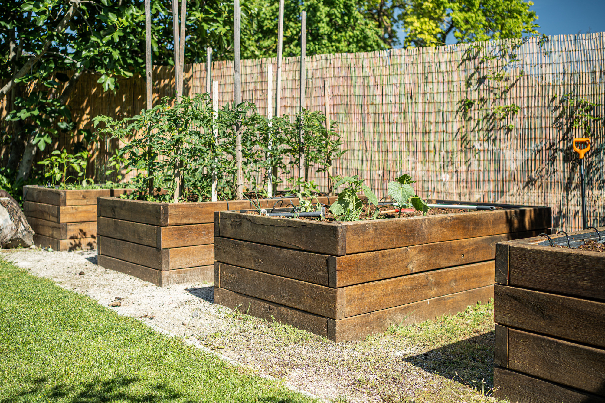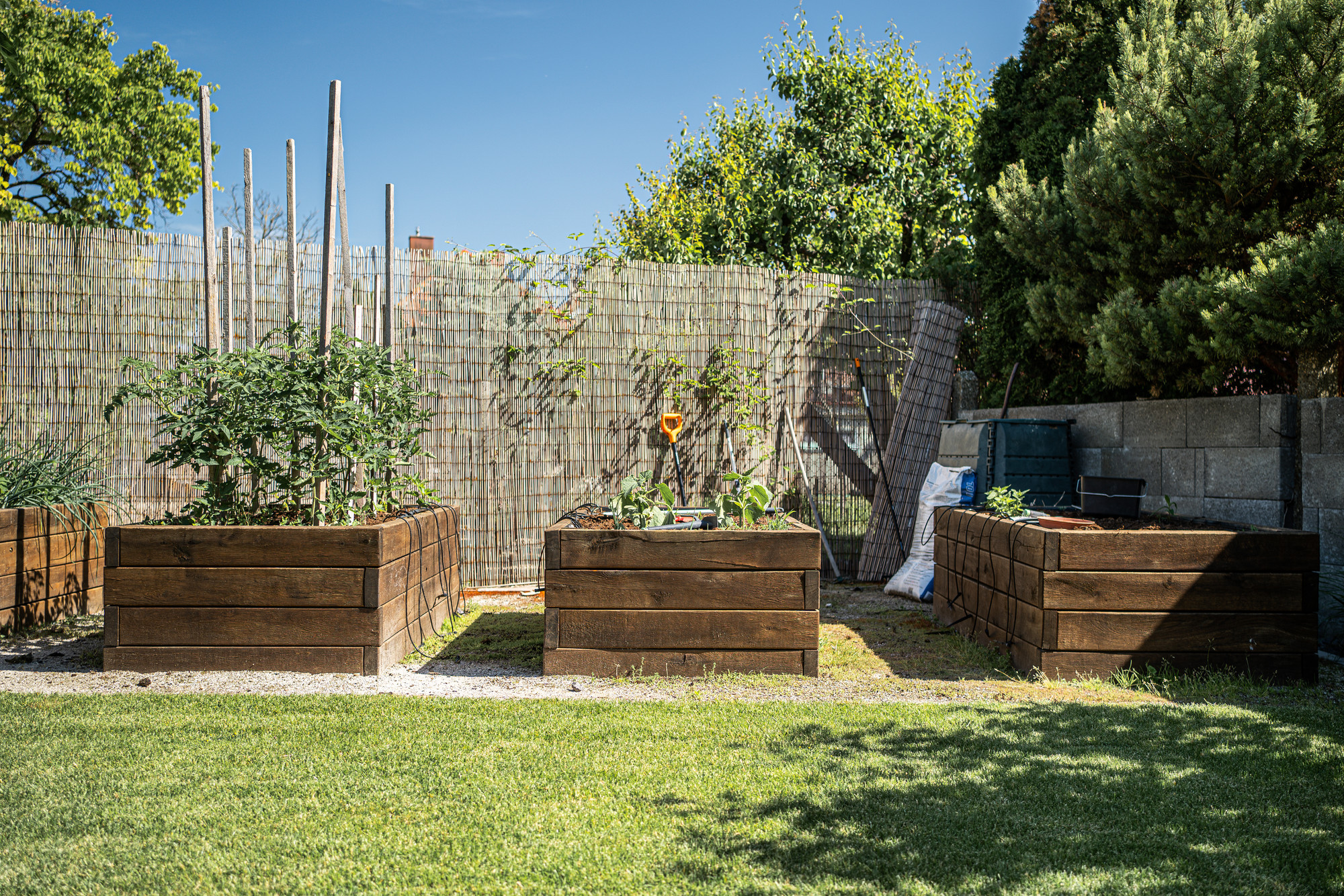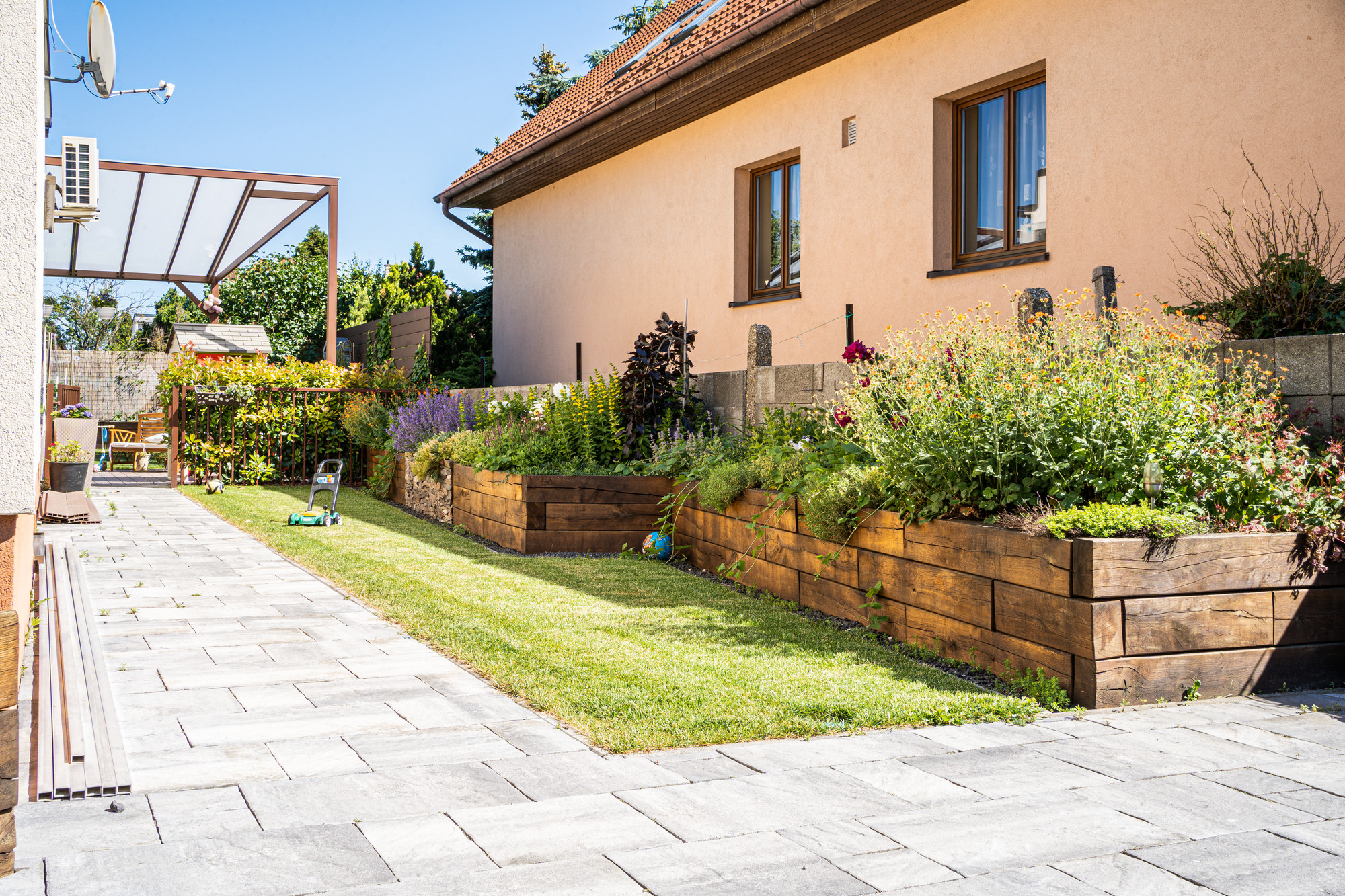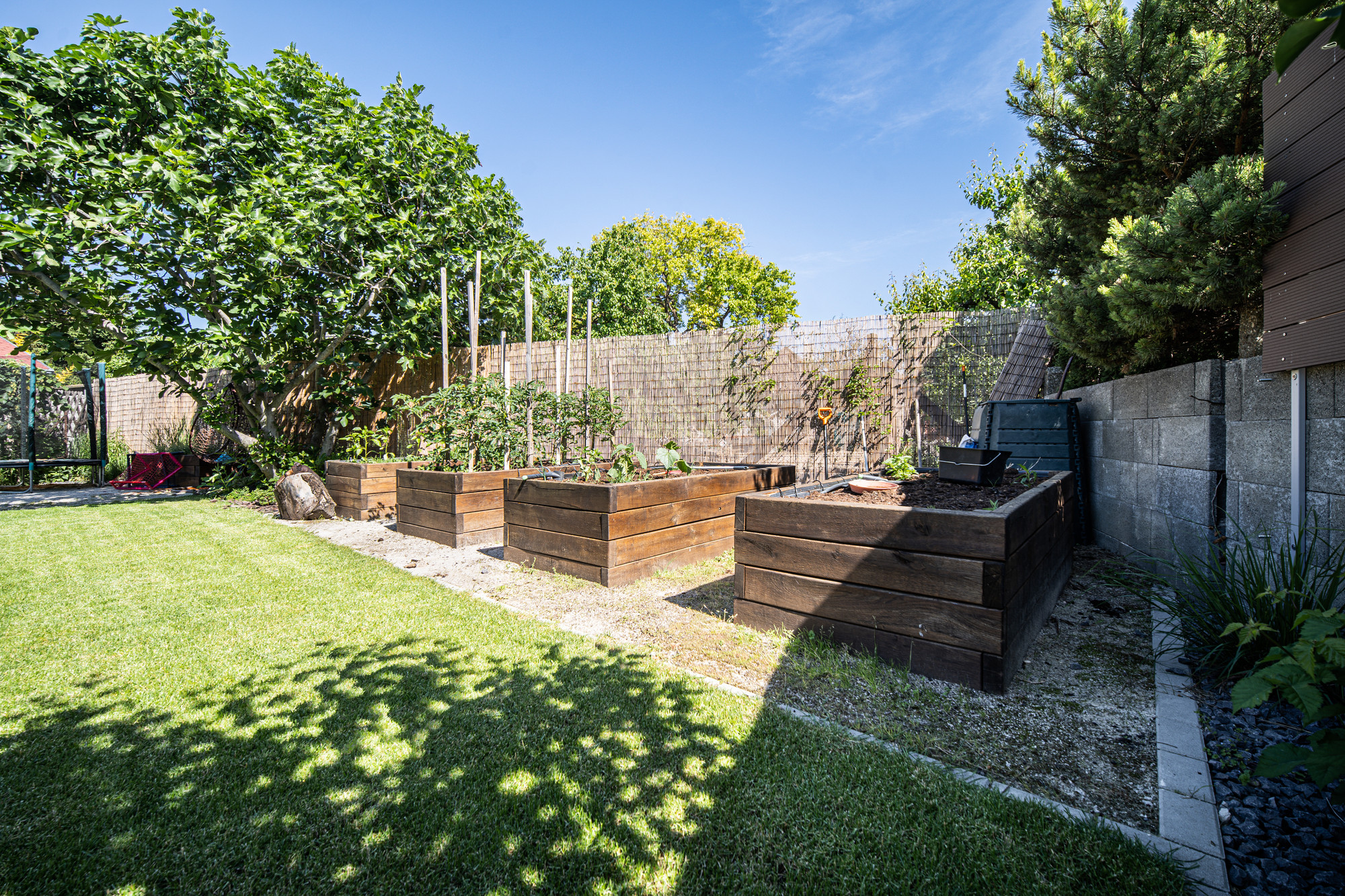 Záhrada zaujme nielen okrasným vyvýšeným záhonom, kde sa kombinuje drevo a kameň, ale aj záhonmi z dubového dreva určenými na pestovanie zeleniny, byliniek či jahôd. Ponúka dostatok miesta na relax aj aktívne vyžitie.