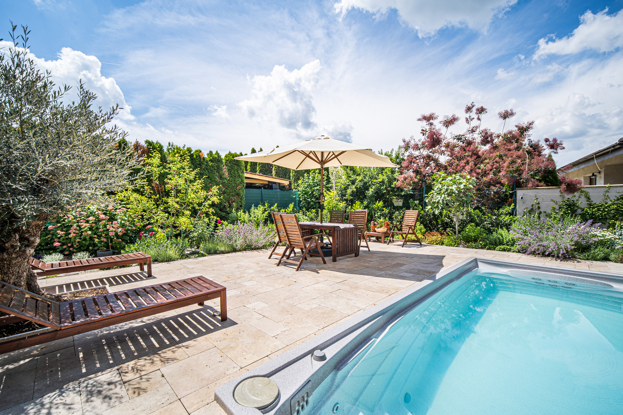 Zaujme romantickou lavičkou medzi kvetmi, malou skalkou aj veľkou terasou s bazénom. Rozkvitnutá od jari do jesene má vždy pripravené nejaké prekvapenie.
